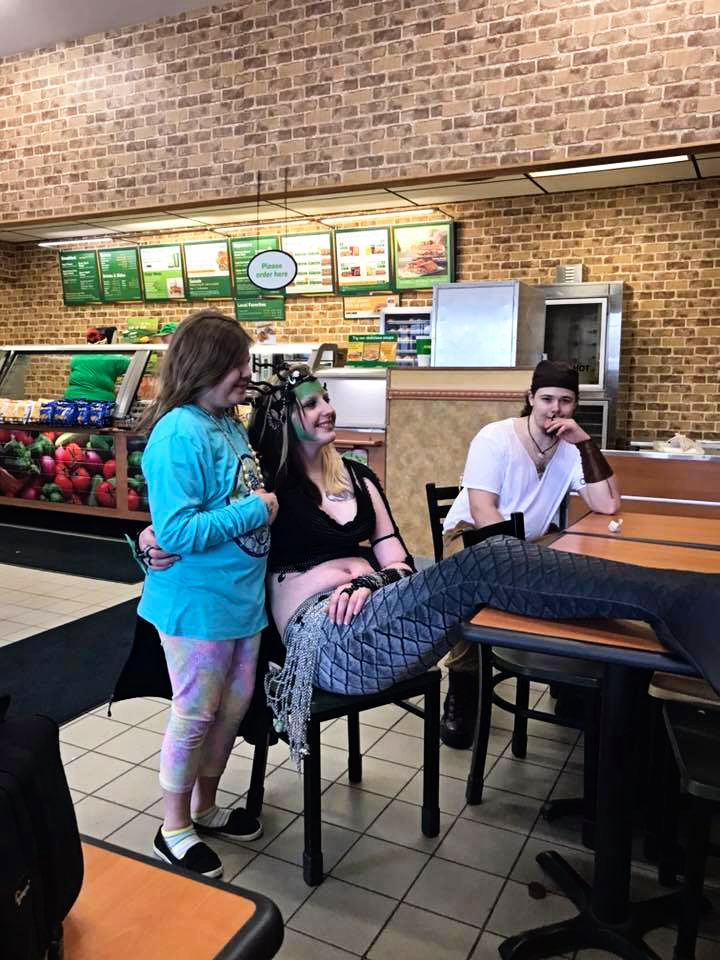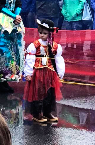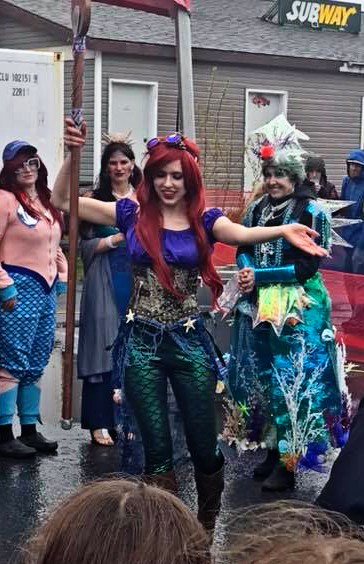 Mermaid Taryn, Terror of the Tides, proved to be the same magnet to children and adults alike as her previous Mersona last year. She smiled, posed, brandished her sword, snuck inside the bakery to warm up – all while being led around and sometimes carried by her First Mate, followed by her faithful entourage.